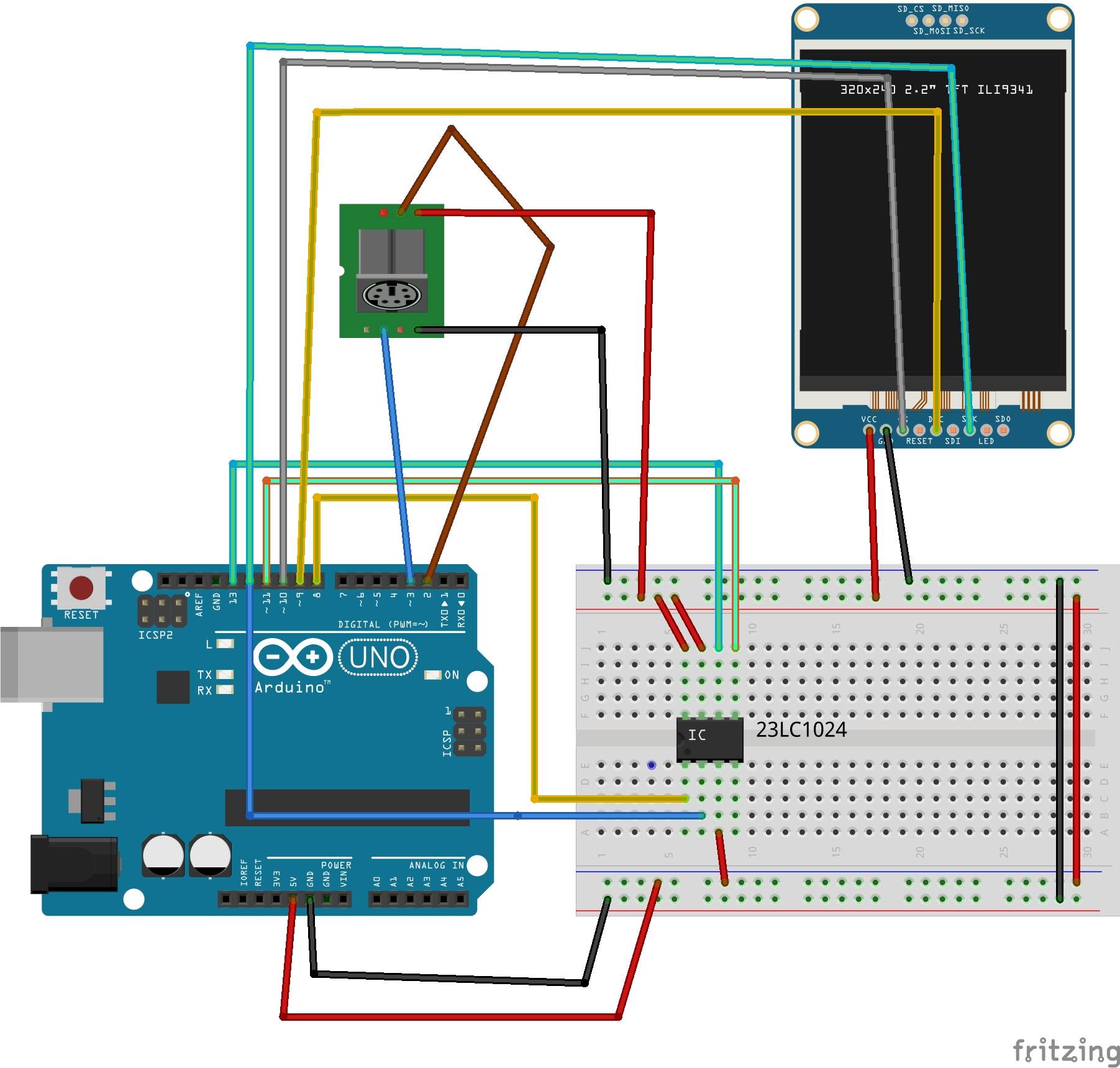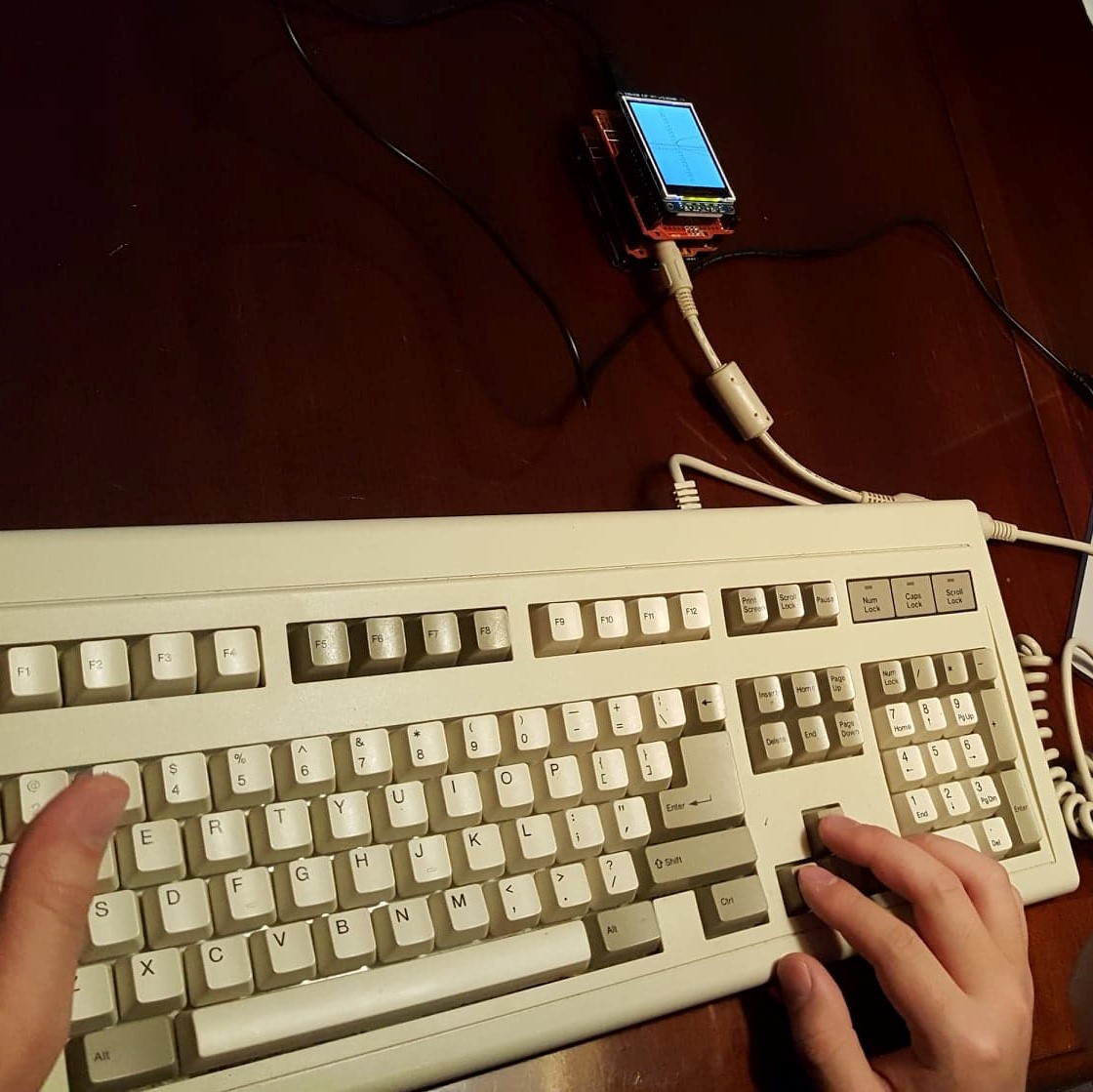 I decided that we would (my partner Andrew and I) have a color LCD screen, and we got a 320×240 job, which seemed like the minimum for a pleasant text and graphics display. The TI-84 is a disgrace for its terrible screen. (I’ve been a calculator enthusiast for a while, if you can tell) Of course, that means that when graphing, the pitiful 2k of ram inside the Arduino has no chance of storing the required data. So, we would need to increase the amount of RAM in an Arduino. I found a SPI SRAM job with 1Mb of memory. Now we had enough memory for graphics and even storage of previous data! For the keyboard I decided to go for PS/2 because it could directly interface with the Arduino, unlike USB, and it was cheap.