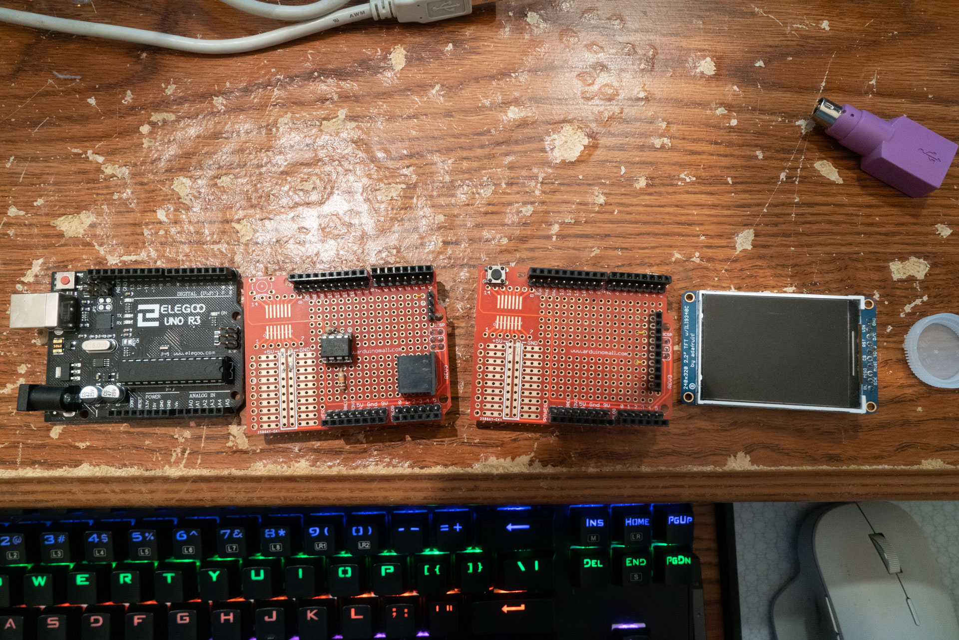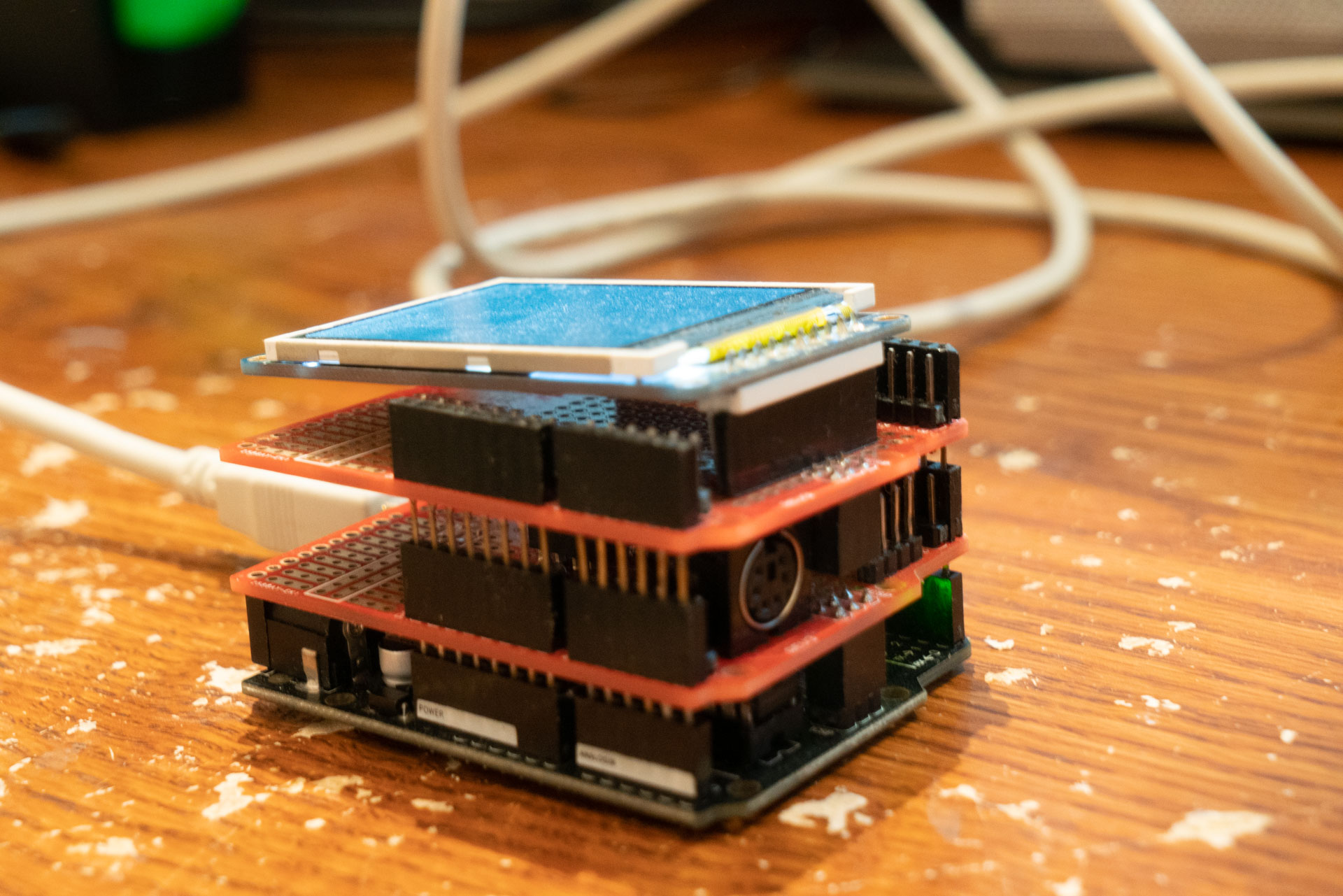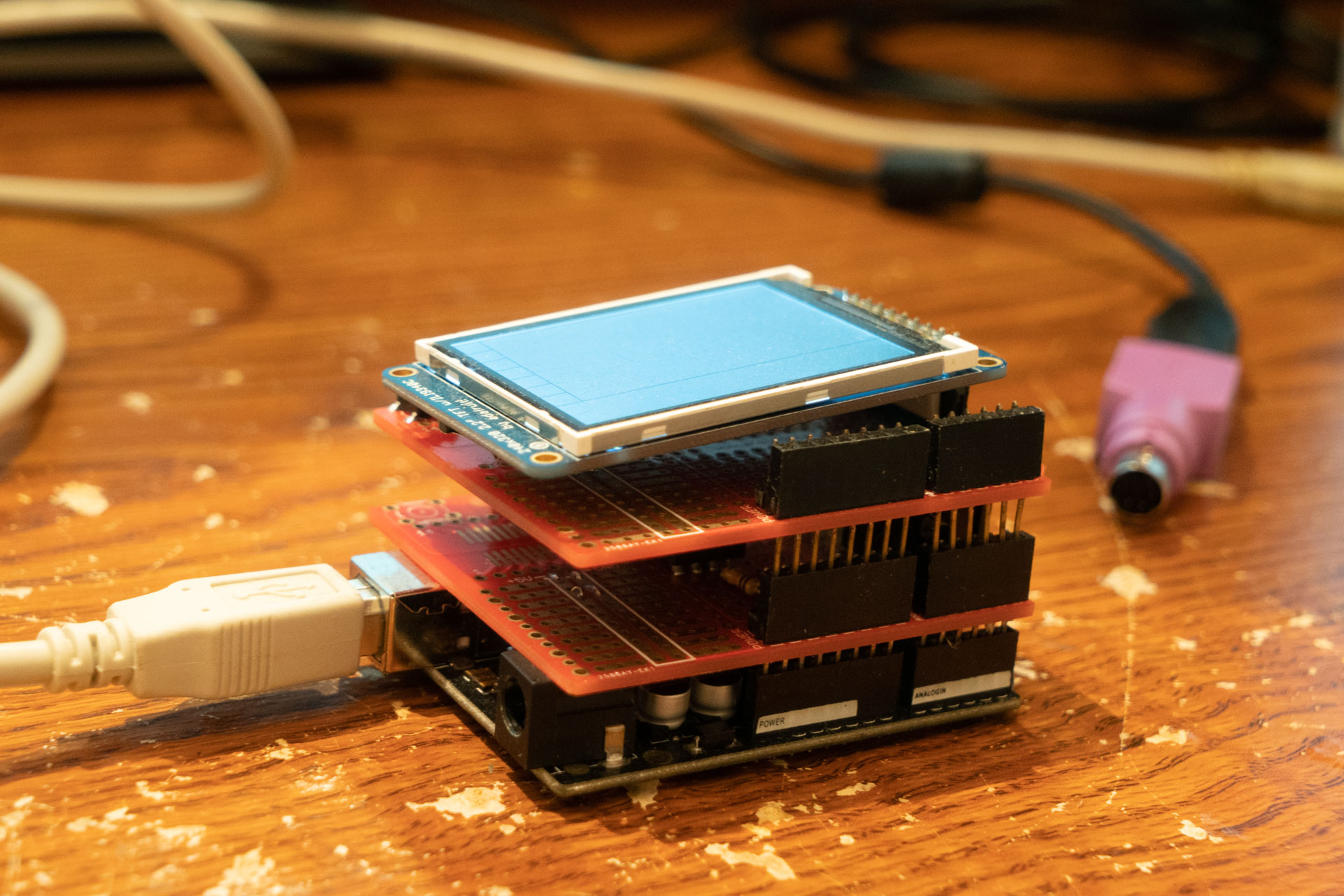 For the physical design, I built the SRAM and PS/2 on one Arduino shield, and made a socket for the LCD on another. They stack together. Unfortunately, the shields I bought were very cheap and reliability is, and always has been, poor.