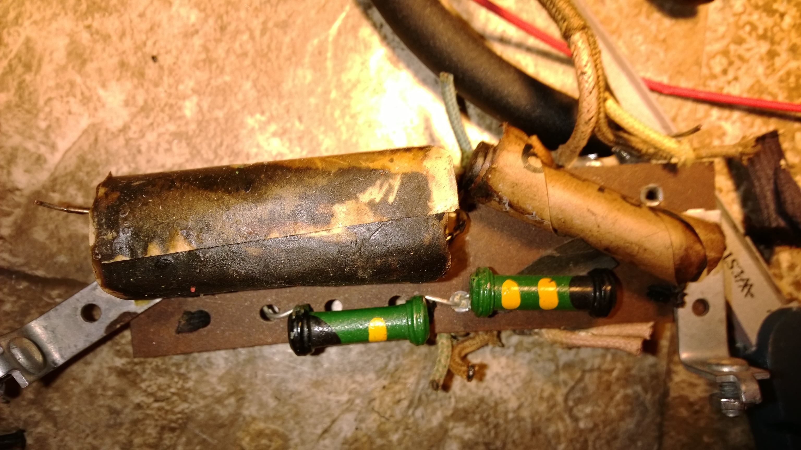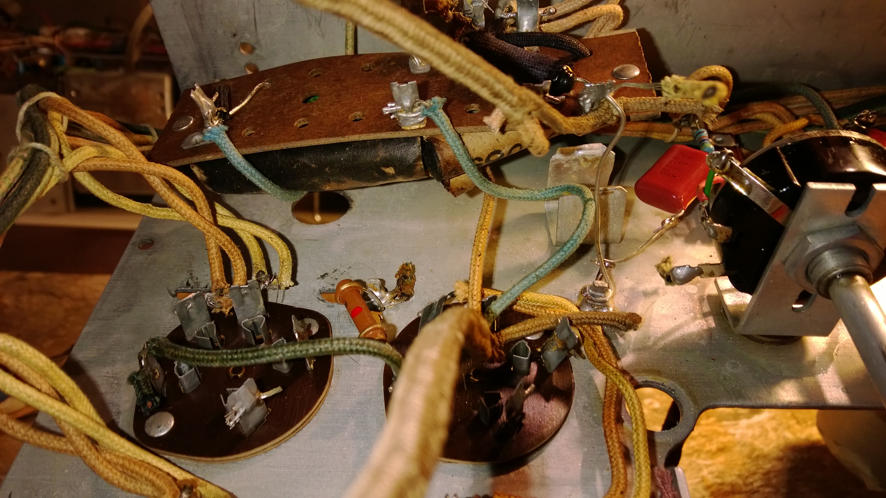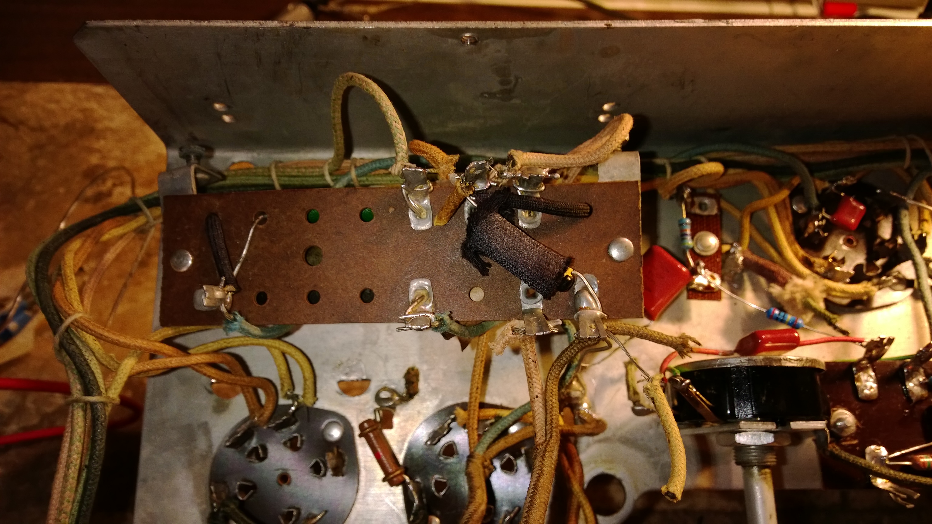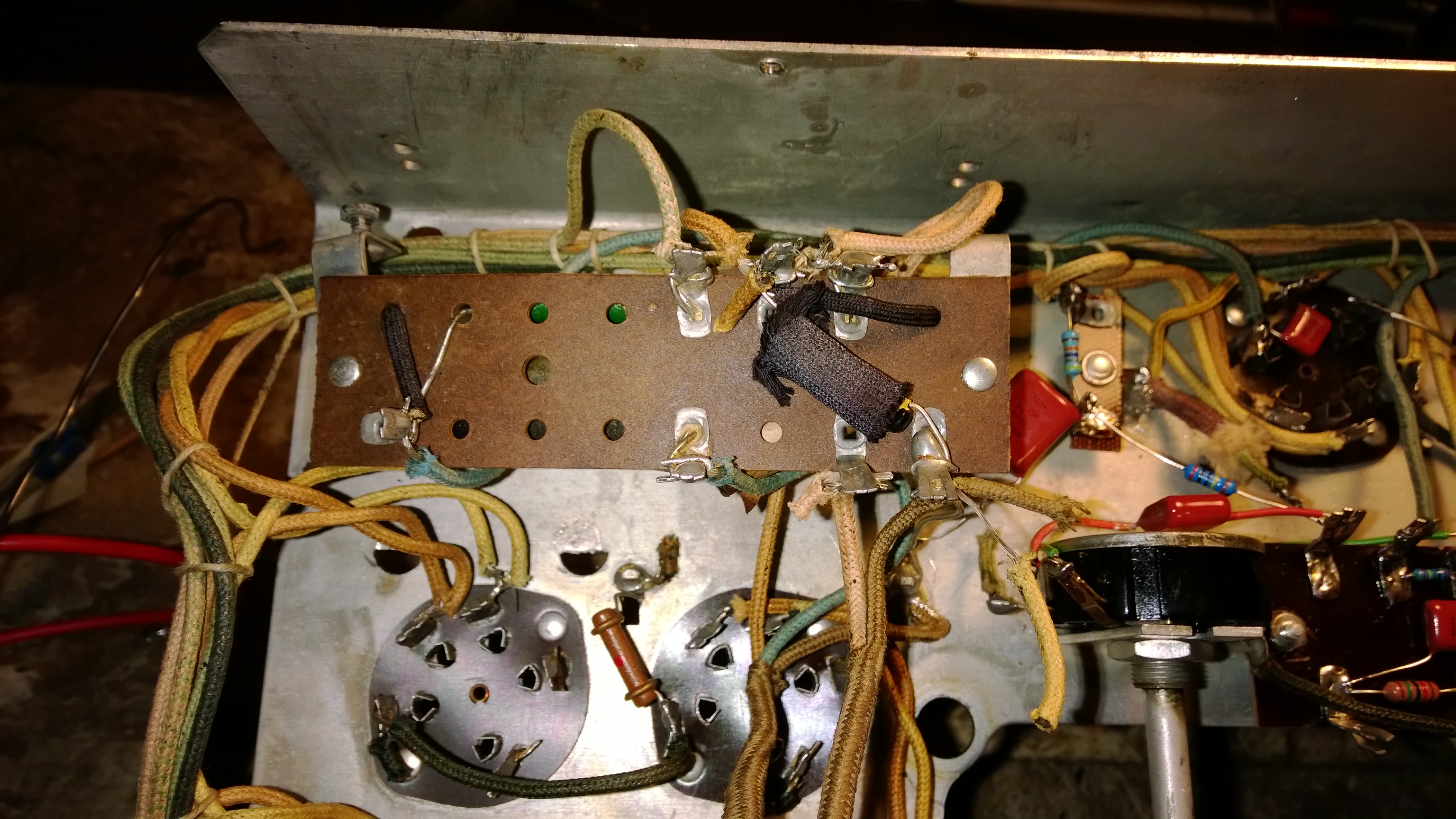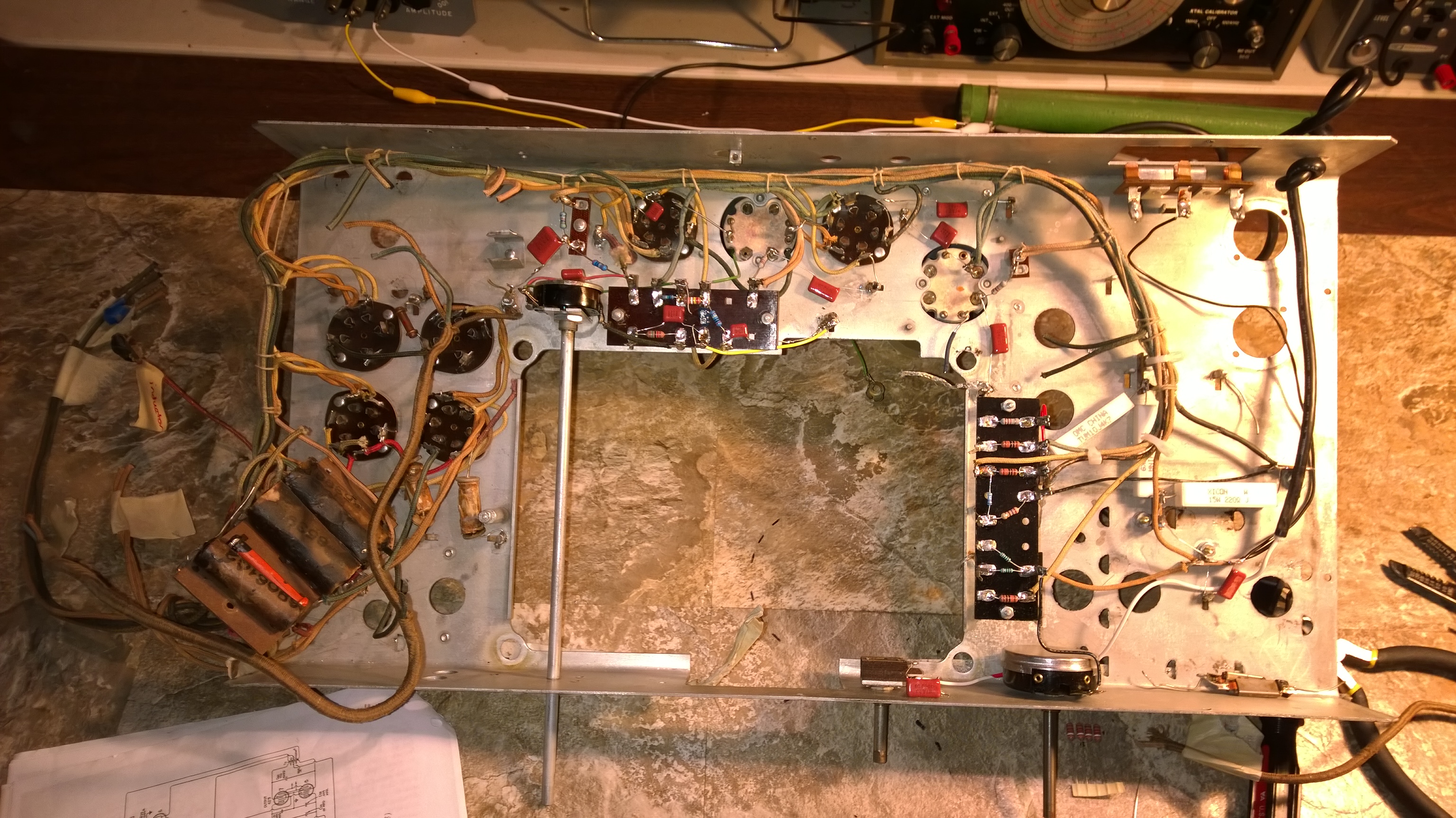 Here is the finished product again. I had to replace all the wiring except the main wire hardness, which I was very happy to be able to. Notice the replacement of those wax cardboard component mounts. They completely disintegrated and I remade them using PC board. You can also see the daughter chassis.