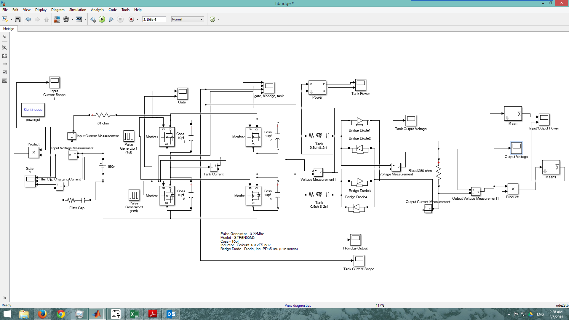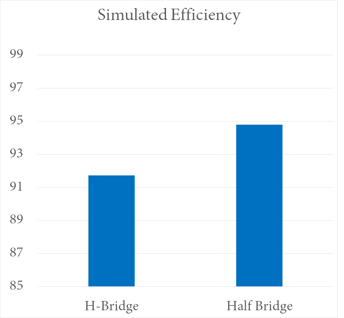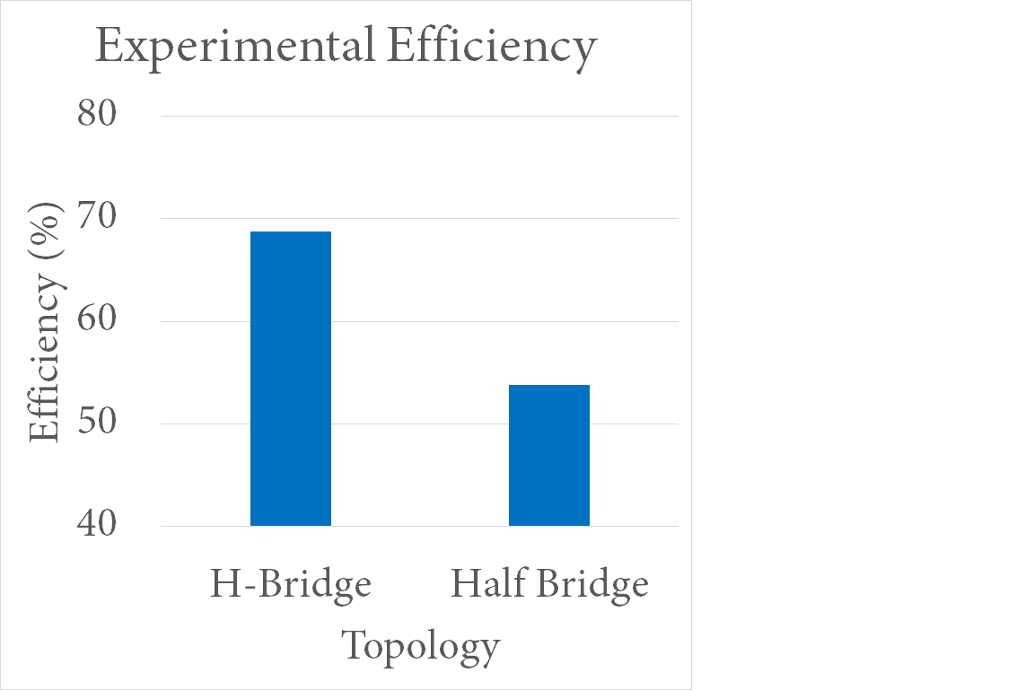 The science fair wasn’t really geared towards engineering projects like this, so I had to have a traditional hypothesis. So, I decided to test to see if there was a difference between H-bridge and half bridge topologies in this applications. In truth, I’m not sure it made a whole lot of difference. I first did some testing in Simulink. Yup, at resonance current and voltage are in phase. Not sure how relevant my simulated efficiency is.