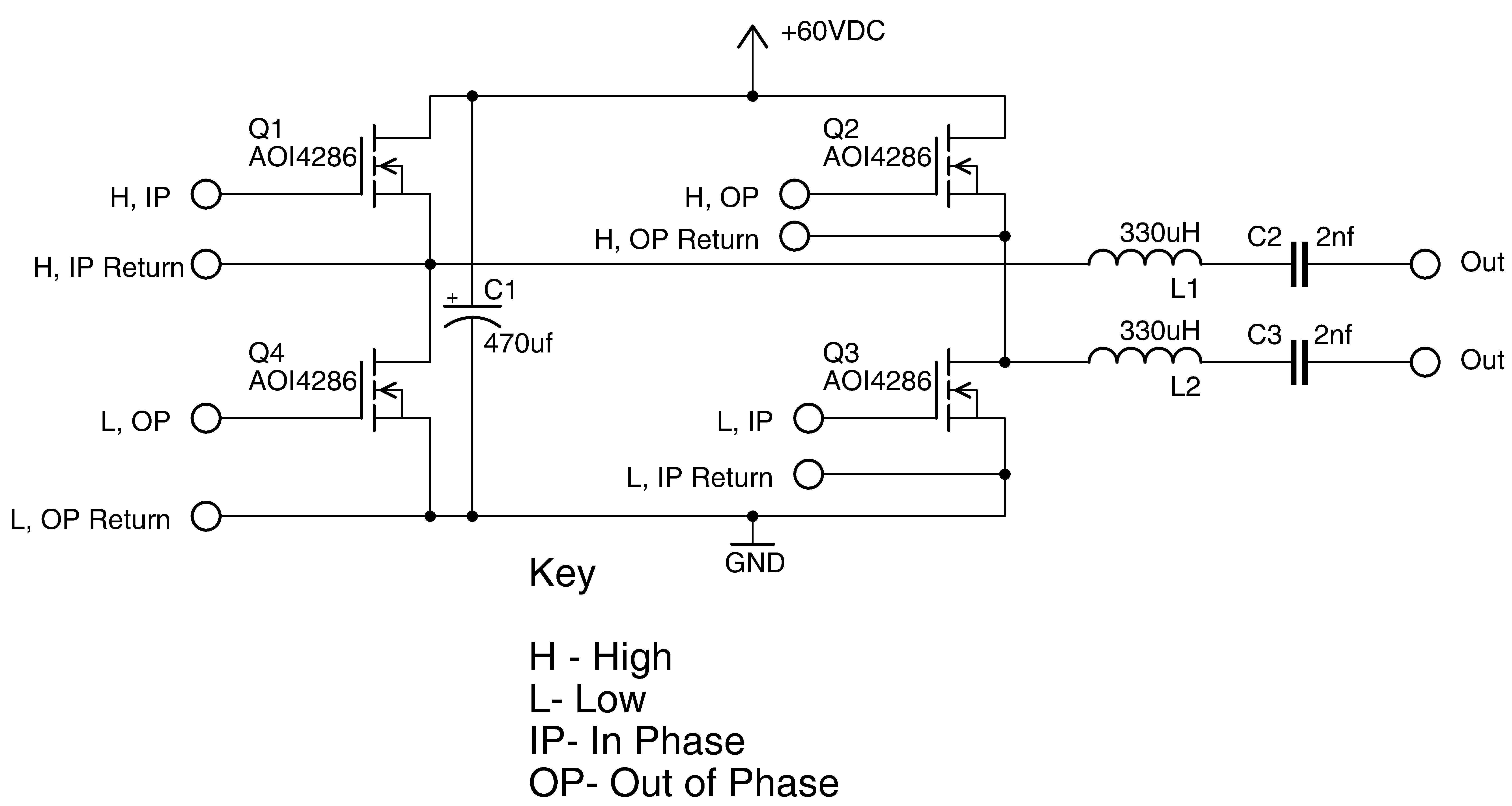 The AC source is an H or half bridge driven by a frequency source at the tank resonance. This is implemented fairly straightforwardly with the IR2113 gate drivers. The bridge MOSFTs were chosen for extremely low RdsON losses, in addition to general high performance. Since there are two series LC circuits in series, the resonance frequency was 200kHz. (1nF and 660uH
