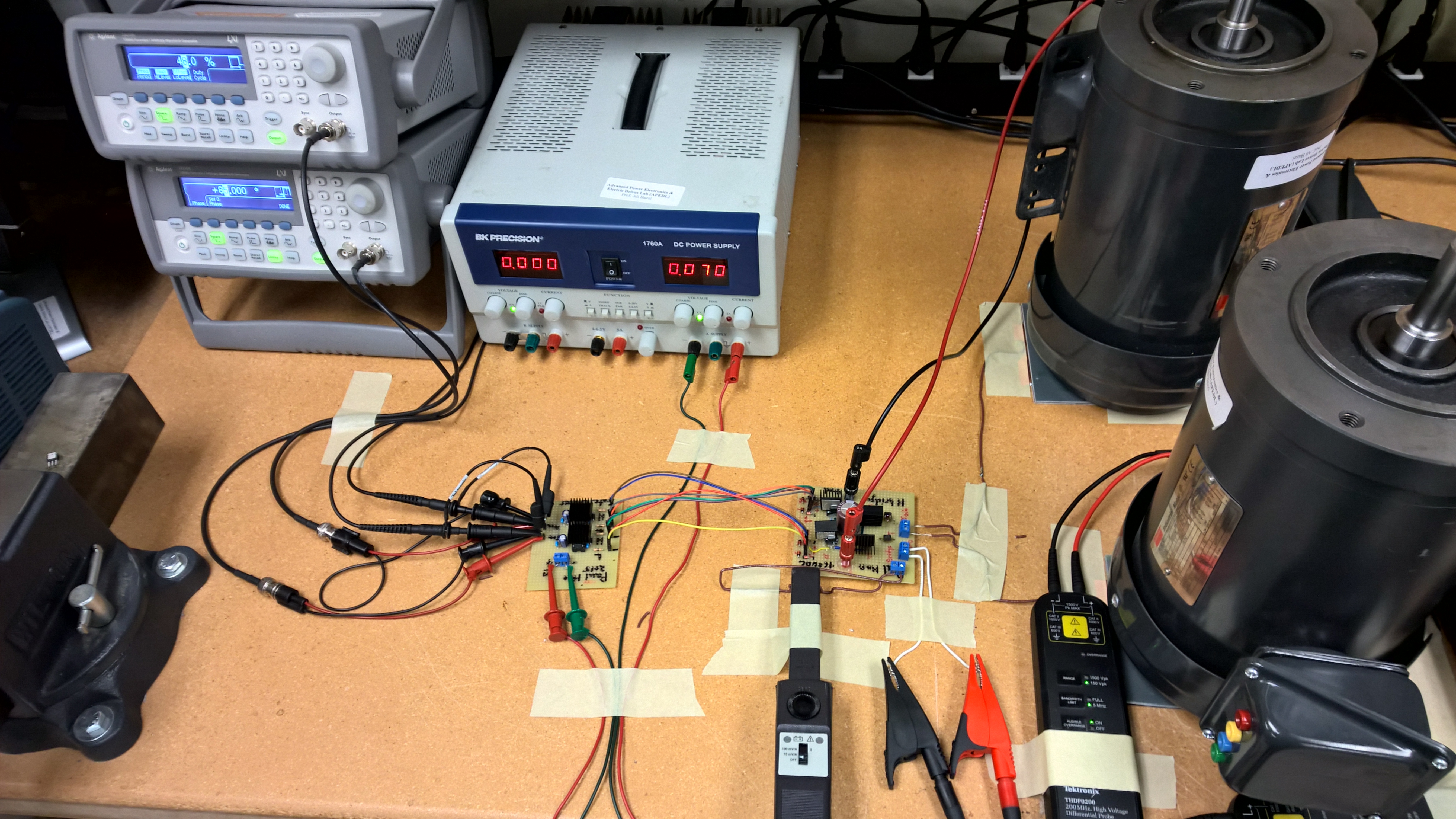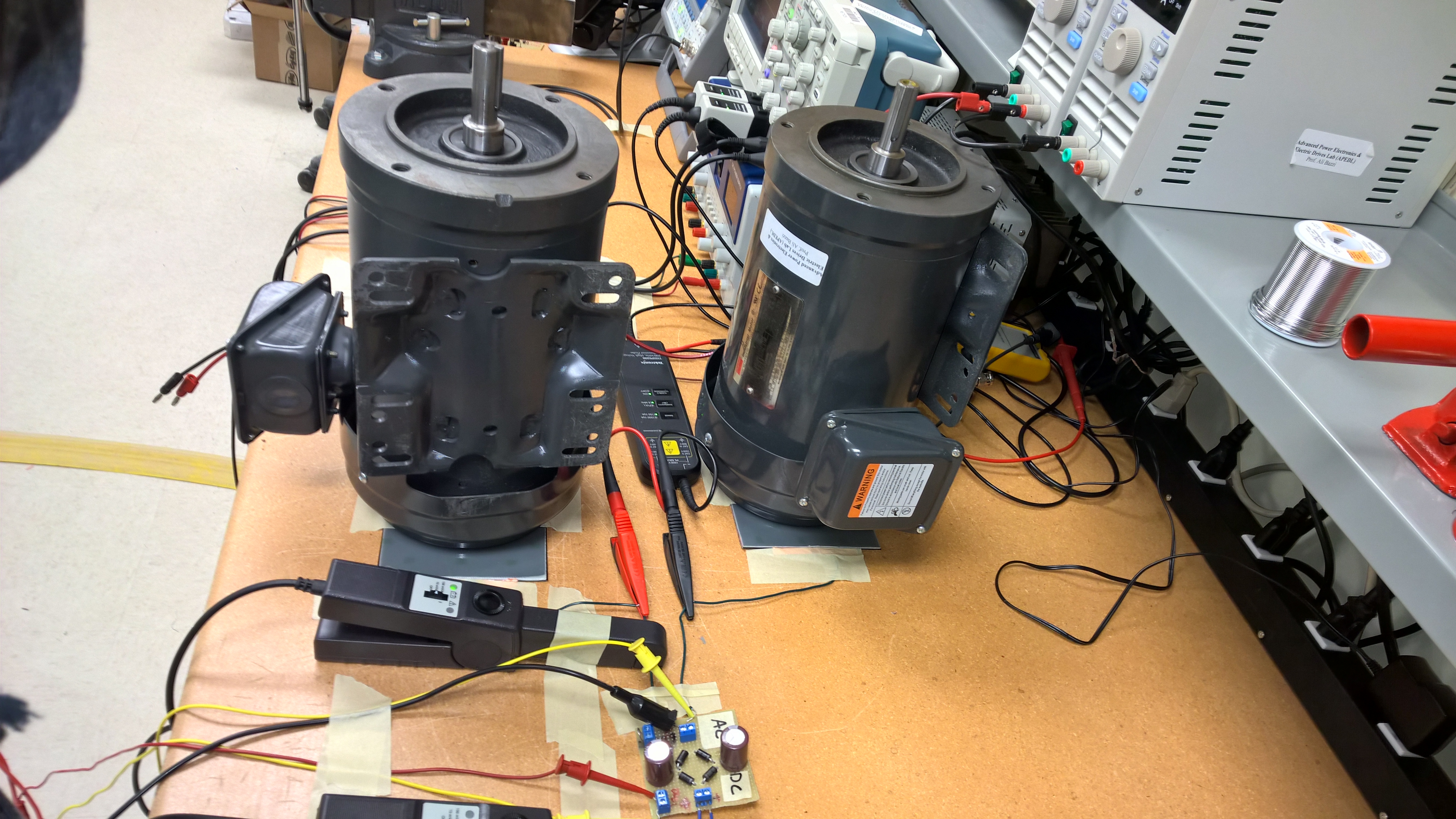 Here’s the set up, in all of its masking tape glory. I’m very thankful that I had access to a lab at the time. While I didn’t receive much guidance, I did get to use all the equipment. In this picture is probably $30,000 of equipment. Tek current probes are expensive!